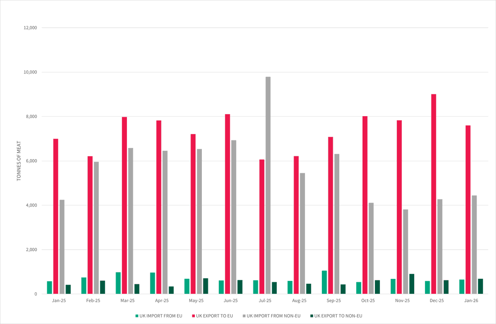 The UK imports from EU decreased by 2,166 tonnes between January 2025 and January 2026 – a decrease of 10.7%. Unsurprisingly, UK imports from non-EU have seen a steady increase to make up for the loss of tonnage. In January 2025, 3,499 tonnes were imported, compared to 7,349 tonnes in January 2026, a 110% increase in non-EU imports. The UK remains a net importer.