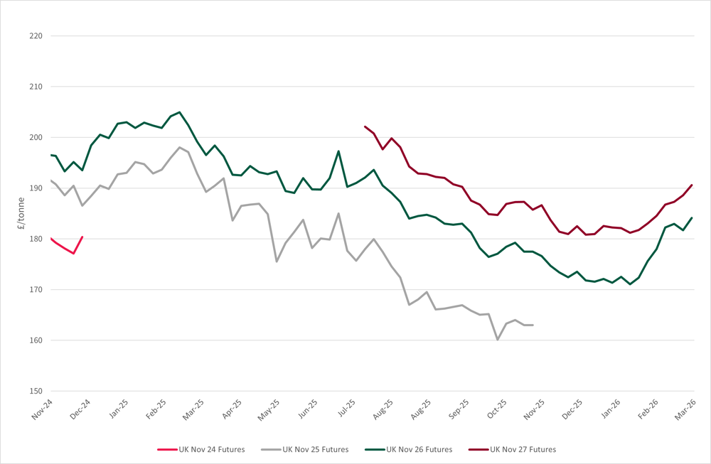 Both November 2025 and November 2026 wheat futures increased at a similar rate, closing the quarter for November 2026 at £184.10/tonne, an increase of £10.60/tonne and November 2027 at £190.6/tonne, an increase of £8.10/tonne.