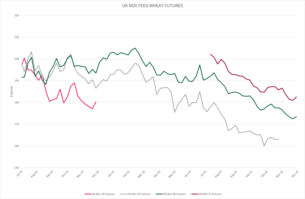 November 2027 wheat futures also continued to fall during the quarter from £190.25/tonne to £182.50/tonne.