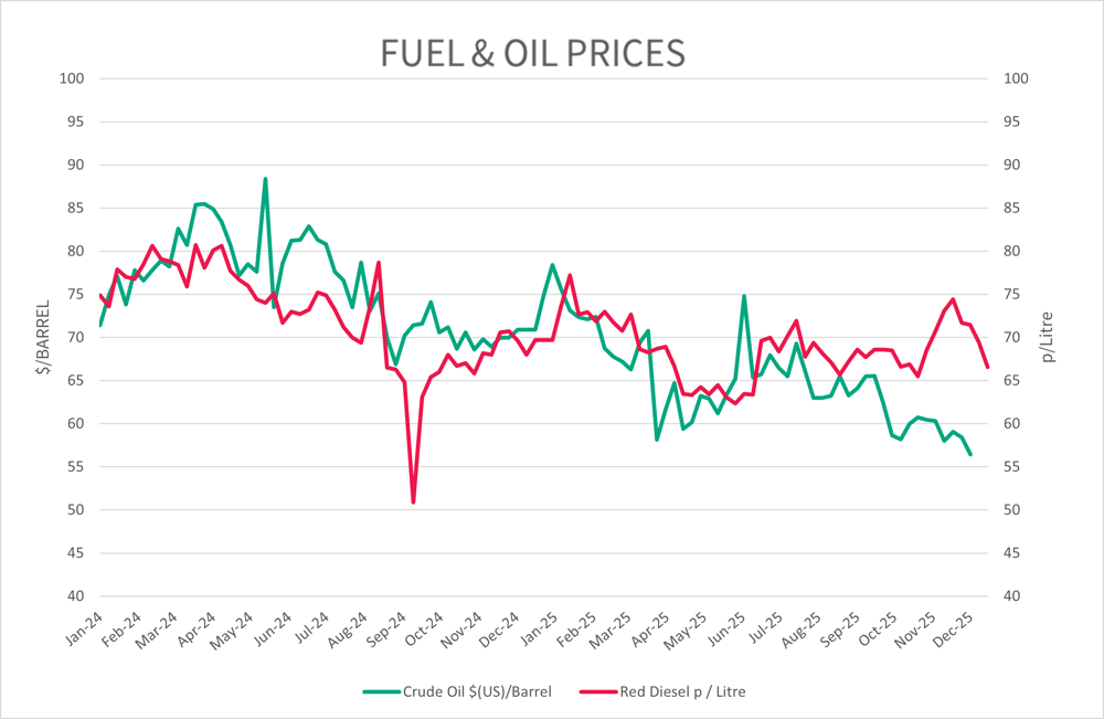 Crude Oil prices have seen a decrease in the last quarter, decreasing by $9.09/Barrel throughout the quarter. Red diesel also saw a decrease of 1.94pence/litre across the quarter ending at 66.56pence/litre.