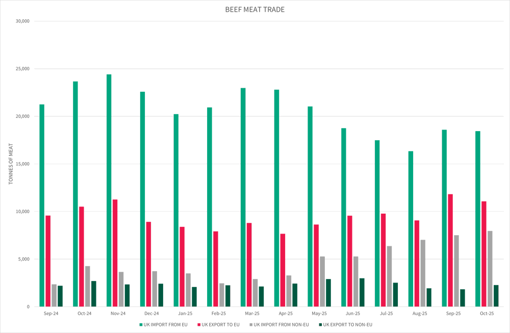 Unsurprisingly, UK imports to EU have decreased from 23,657 tonnes in October 2024 to 18,444 tonnes in October 2025. The UK remained a net importer for beef meat in October 2025 with a net balance of 13,050 tonnes.
