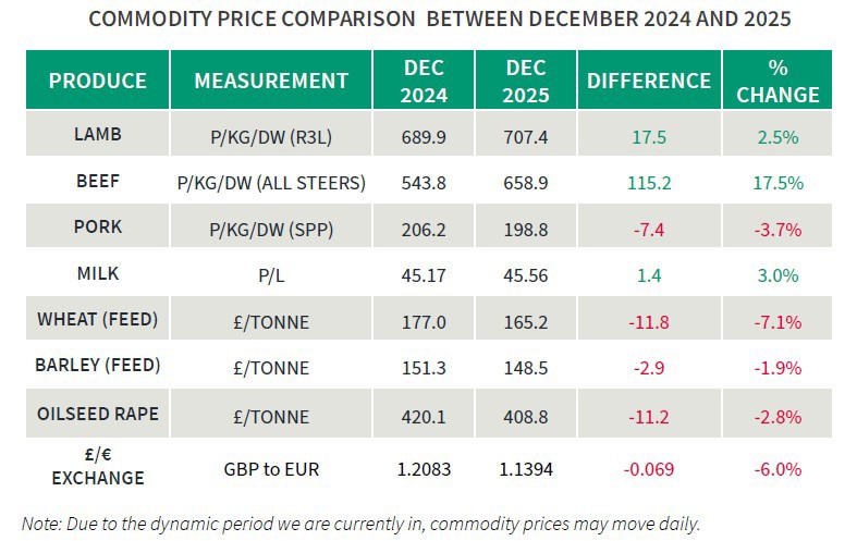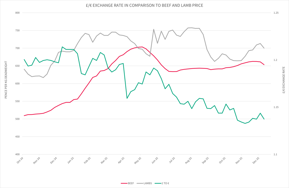 Lamb prices experienced an increased price in quarter four, hitting a high of 713.1p/kg/dw (R3L) in mid-December 2025, an overall increase of 28.6p/kg/dw from the end of the last quarter.
