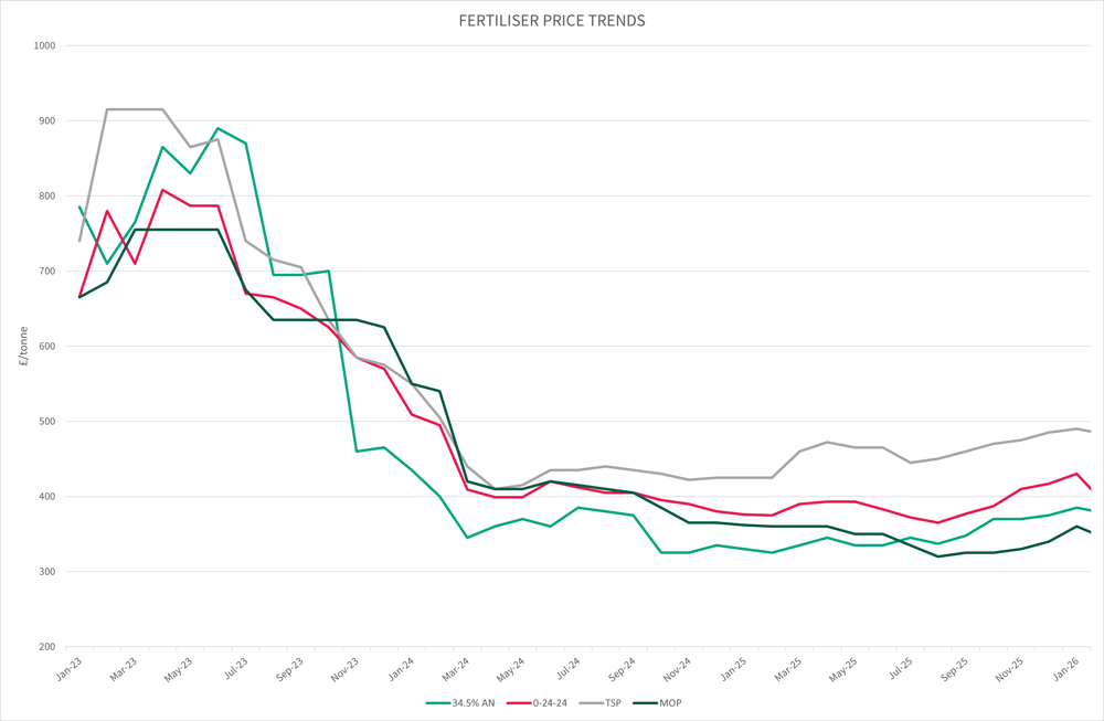 34.5%AN started the quarter on £390/t and ended the quarter at £405/tonne. 0-24-24 has decreased over the quarter by £42/tonne. In the same period, TSP has decreased by £32/tonne to £498/tonne and MOP decreased by £21/tonne, ending the quarter at £349/tonne.
