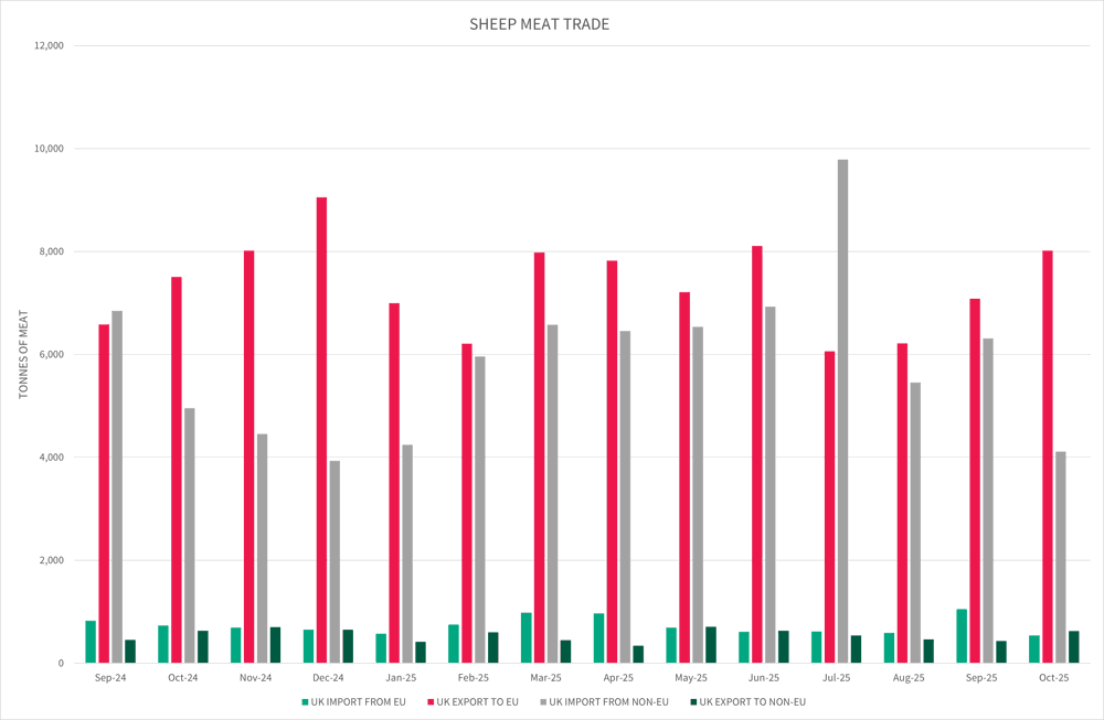 UK export to non-EU remained relatively static, compared to UK import from non-EU which have decreased since October 2024 with 4,952 tonnes to 4,110 tonnes in October 2025. This resulted in the UK being a net exporter for sheep meat in October 2025 with a net balance of 3,993 tonnes.