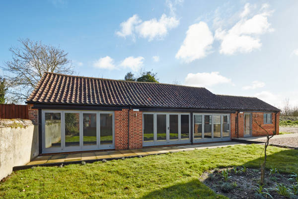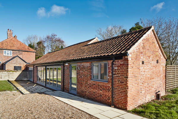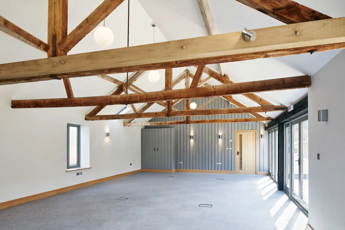 This single storey barn is the first of two conversions and a new build, on a small rural commercial office scheme. The building was redundant and used for storage, prior to its reimagining as a compact business space. The open bay character of the building has been maintained, with the installation of large, glazed sections and doors. One end of the building has been used as a small kitchen and ancillary facilities, with the main body of the building forming a single open office space. The character elements of the building have been maintained, with exposed roof truss details picked up with feature lighting. The interior cladding panels, bring the rural character into the space, and combining with the high-quality interior joinery.