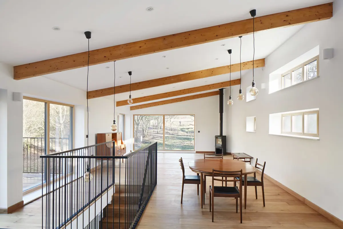 The key to the success of this property is its ability to connect with its setting. Clad in Larch and surrounded by an acre of mature woodland, with a Country Park as its backdrop; the upside-down floor arrangement and large external deck at first floor, ensure that the occupiers can live in the tree canopy. Solar panels and a ground source heat pump ensure that the house is not just energy efficient, but its running costs are significantly reduced. The owners are working on a new extension with us and we look forward to bringing this project to site in 2022.